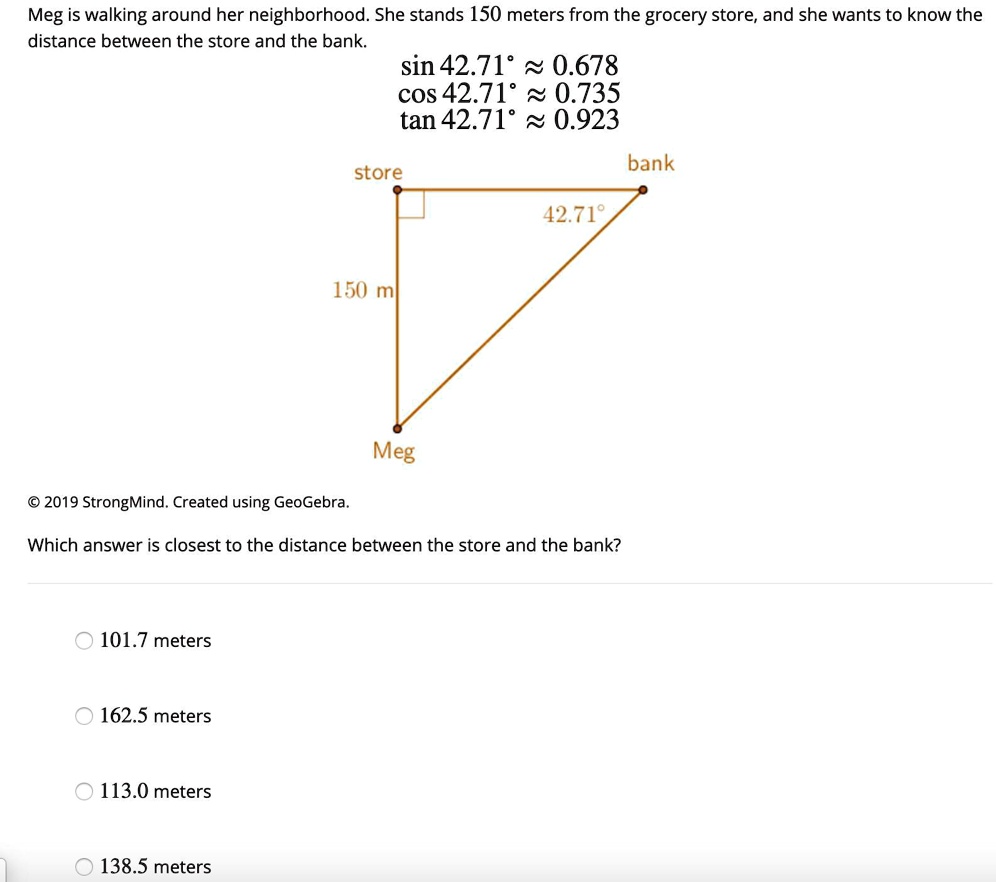 Solved Meg Is Walking Around Her Neighborhood She Stands 150 Meters From The Grocery Store And She Wants To Know The Distance Between The Store And The Bank Which Answer Is Closest